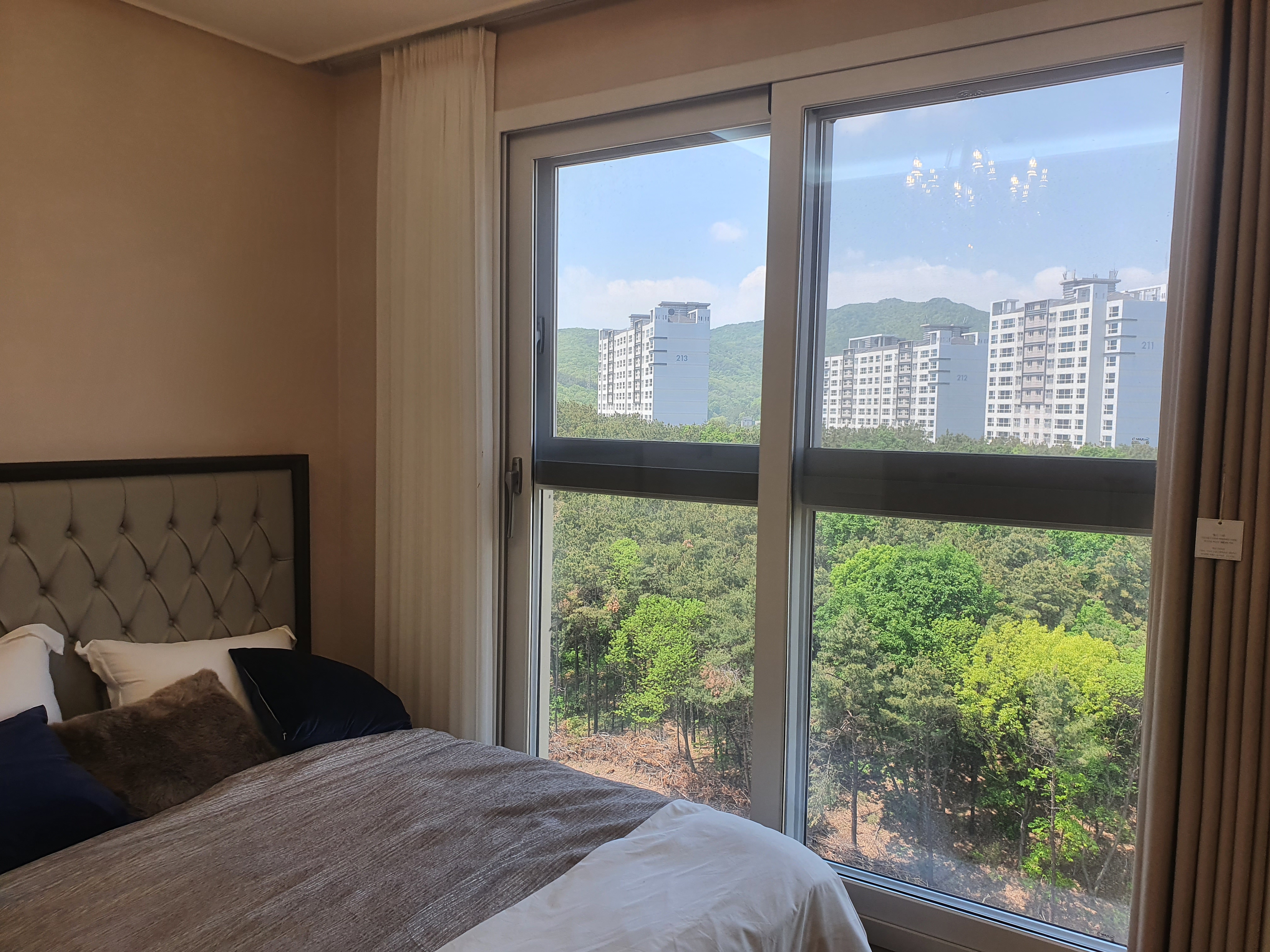 저녁 무렵, 창문을 열면 광교산 능선 너머로 석양이 물듭니다.
