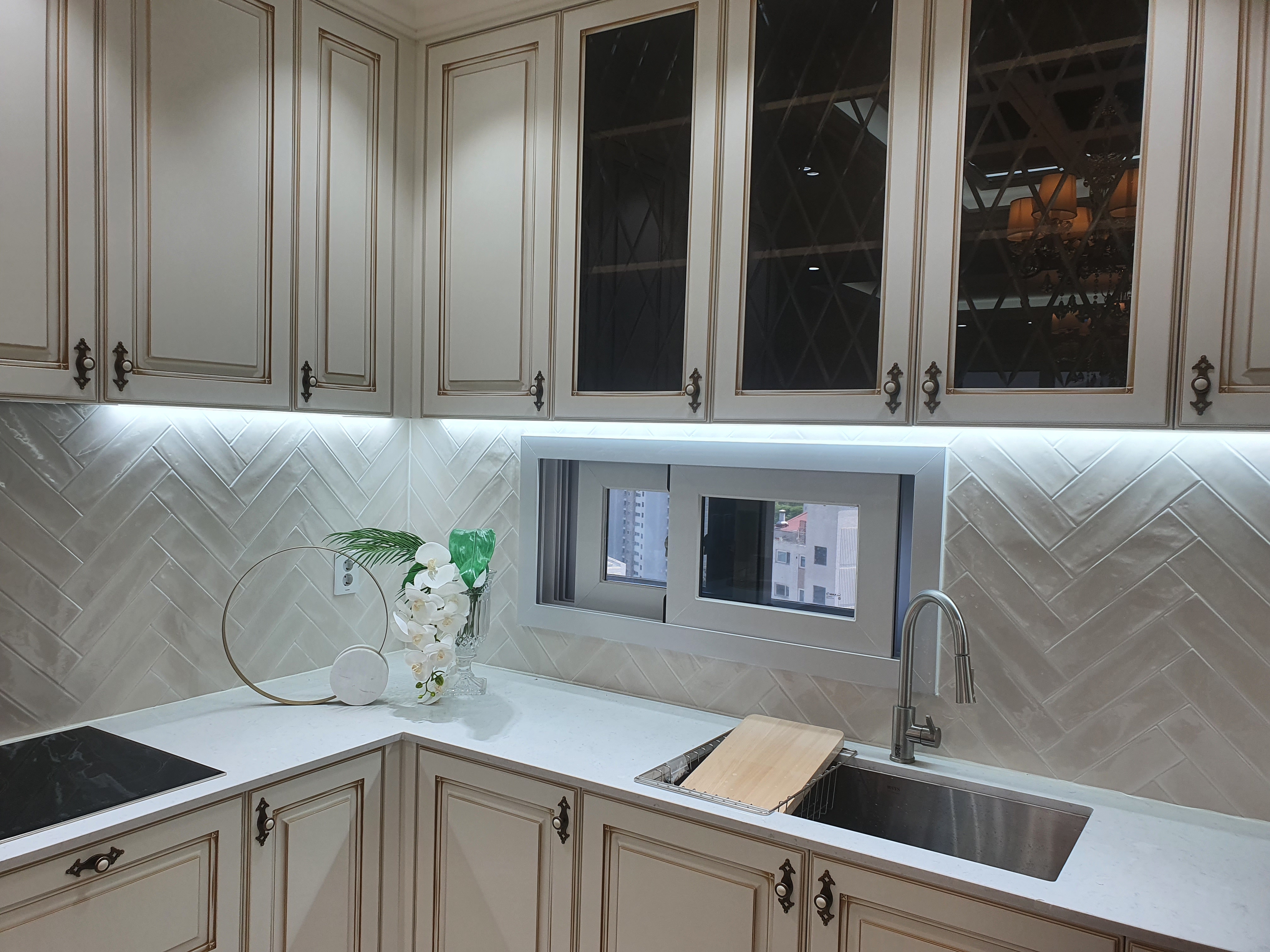주방에서는 은은한 샹들리에 불빛 아래 아이가 그림을 그리고,